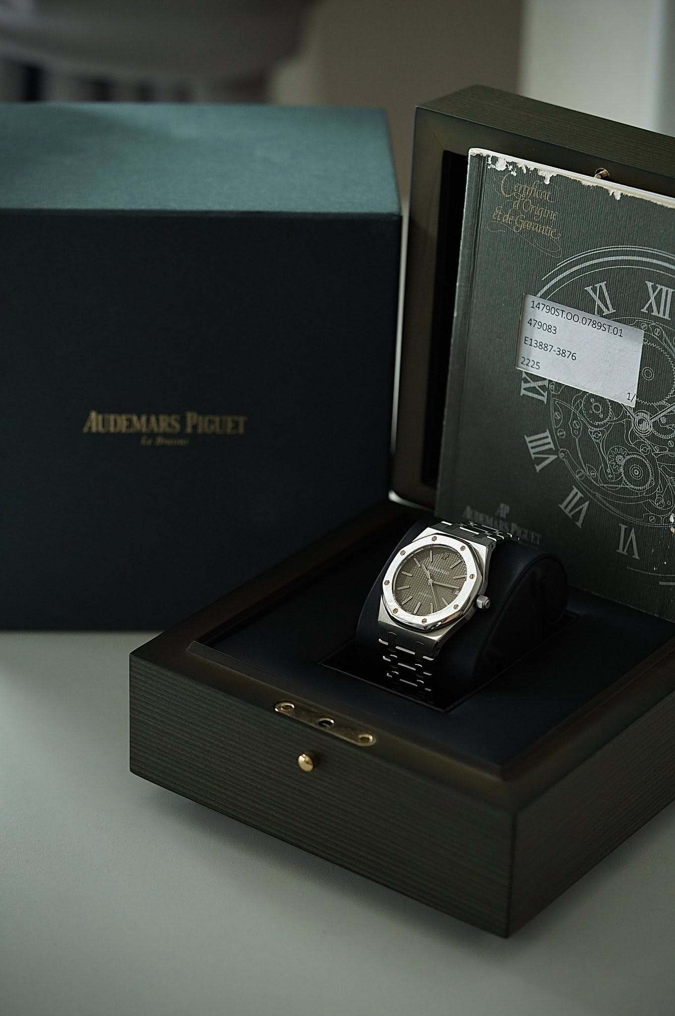 14790ST นี้เป็นนาฬิกาสตีลซีรีส์ที่สองจากยุค 1990s ซึ่งเป็นที่รู้จักจากโลโก้ ‘AP’ ที่ตำแหน่ง 12 หลัก หน้าปัด ‘Petite Tapisserie’ เป็นเอกลักษณ์ของ AP หน้าปัดสีดำดั้งเดิมซีดจางจนกลายเป็นสี “Tropical Olive Green”