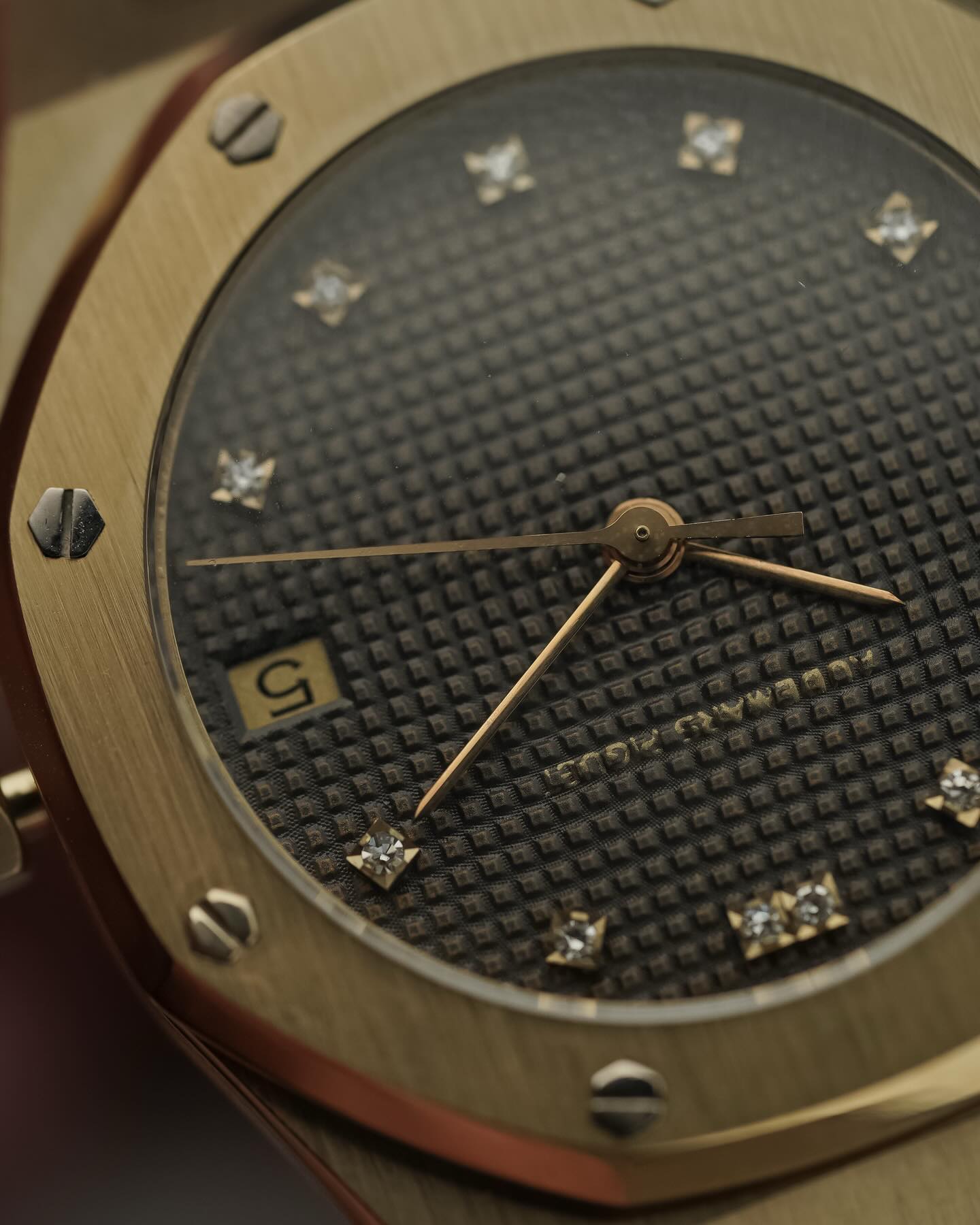 ชื่อแบรนด์บนหน้าปัดจาง มองเห็นเฉพาะบางมุม เพิ่มเสน่ห์ความมินิมอล ตัวเรือนและขอบ Bezel ทอง 18K คมสวย