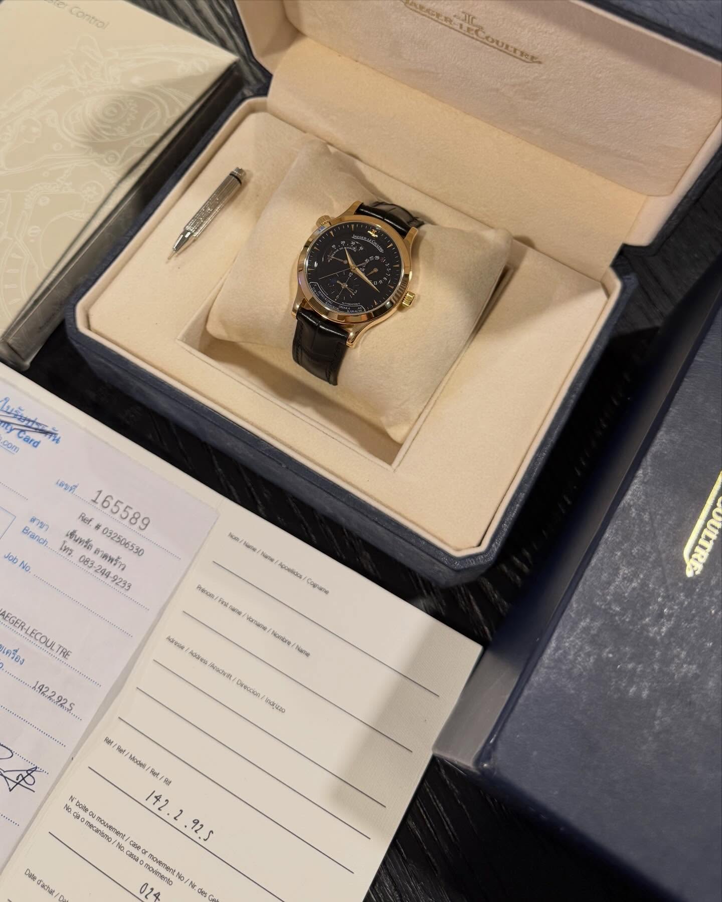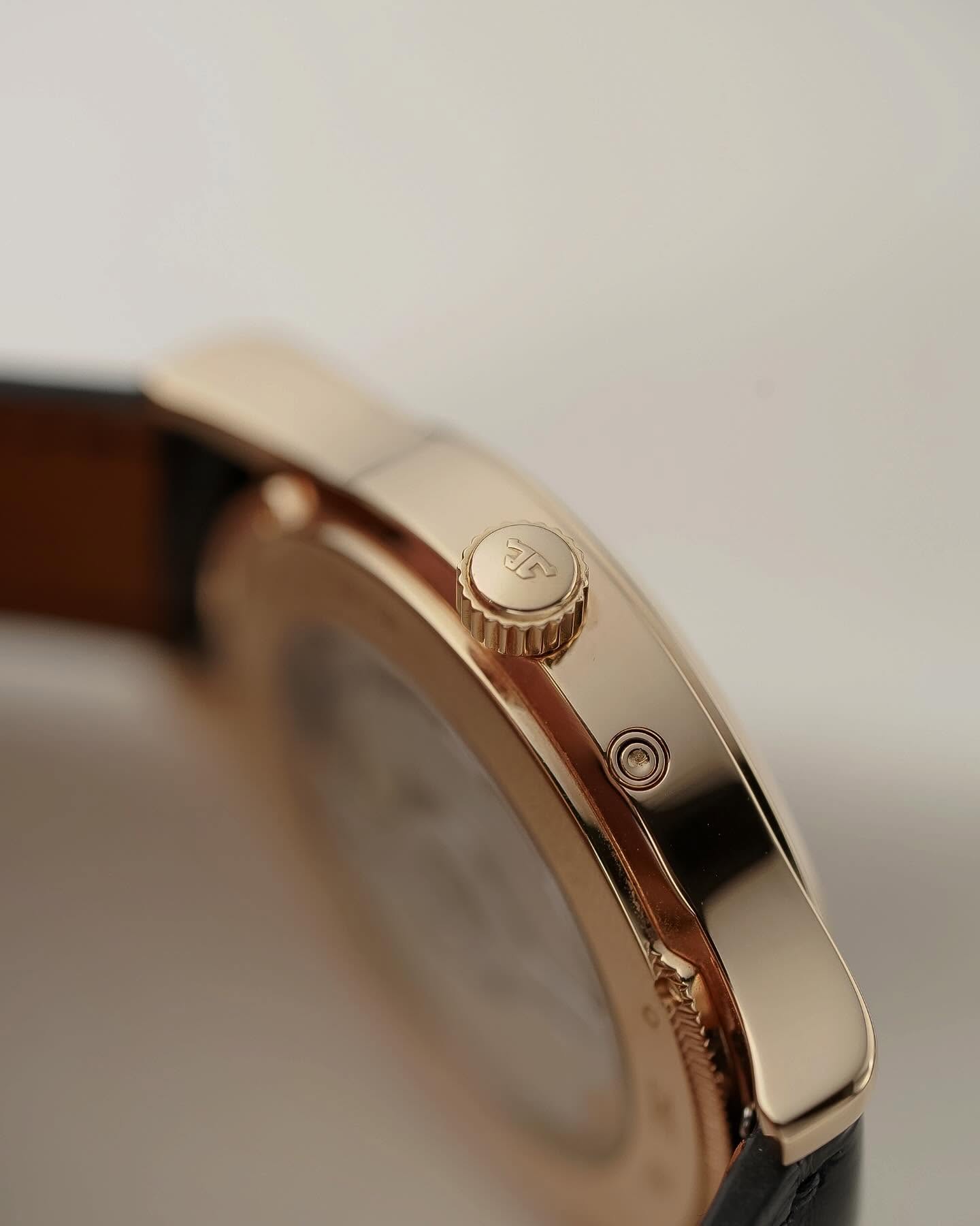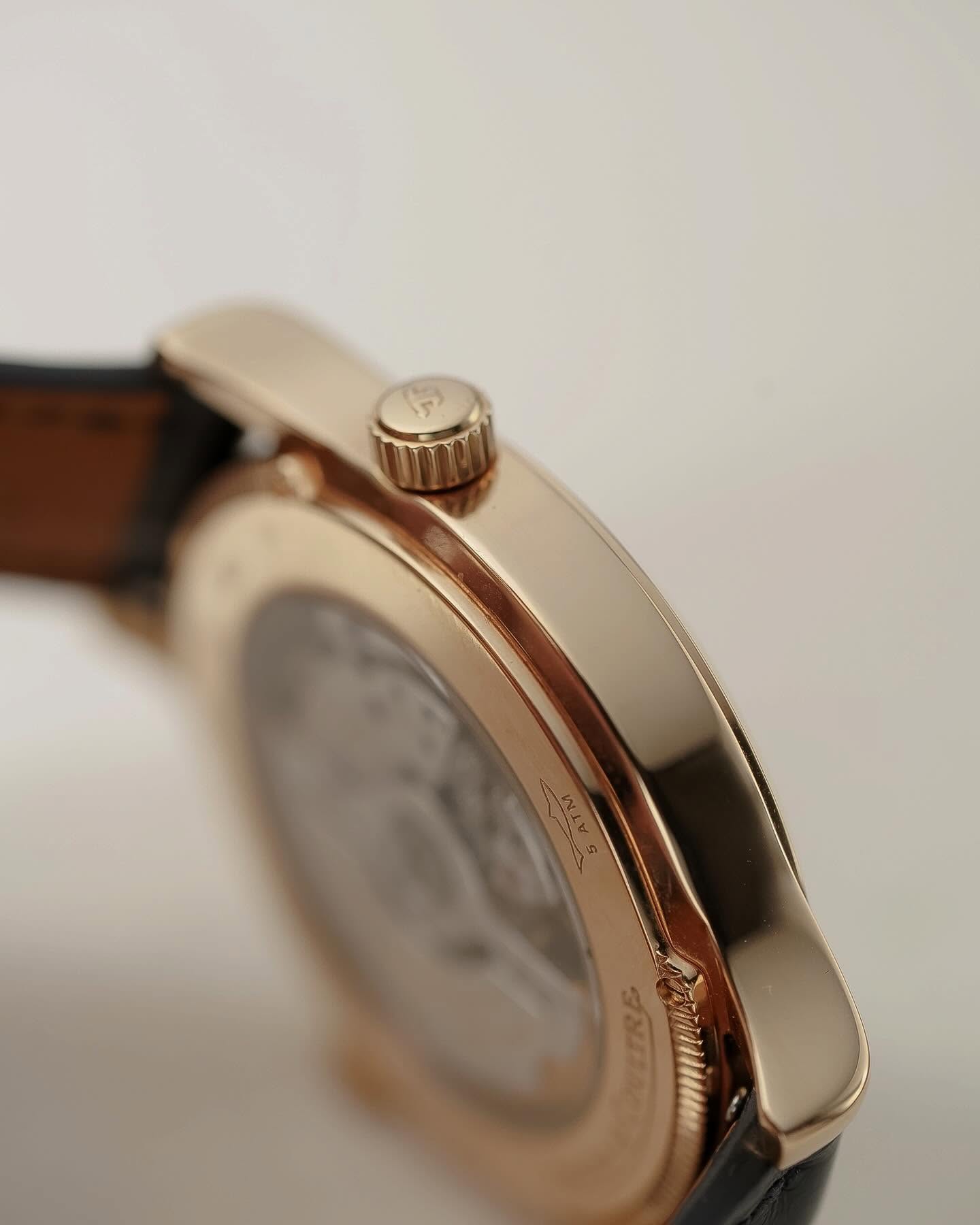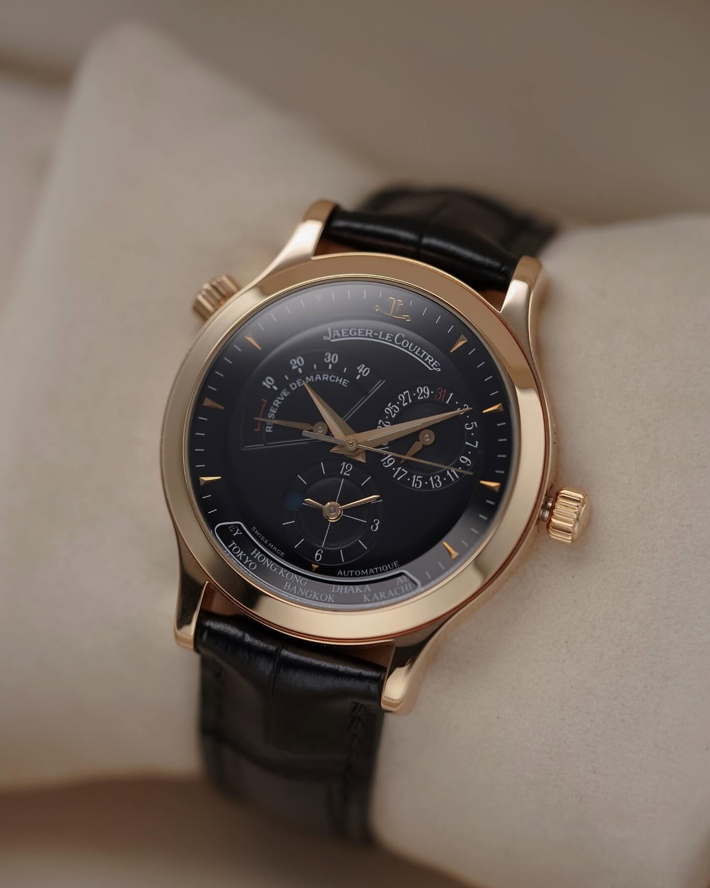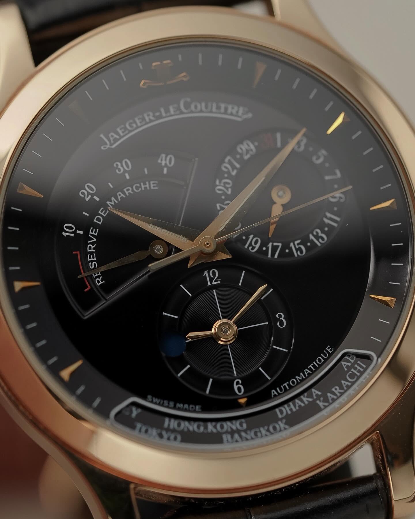 นาฬิกาที่สวยสมบูรณ์แบบด้วยฝีมืระดับโลกอย่าง JLC เรือนนี้วัสดุ RoseGold หน้าปัดขนาด 38mm หน้าปัดสีดำตัดกับ ชุดเข็มและหลักชั่วโมงที่เป็นทองคำ เรือนนี้จัดเต็มด้วย ฟังก์ชั่น Geographic Time Zone แสดงเวลา 2 ไทม์โซพร้อมกัน วงล่างคือชื่อเมืองสำคัญทั่วโลก เพียงแค่หมุนเลือกเมือง เวลาก็จะปรับให้ทันที และมี Power Reserve แสดงอยู่บนหน้าปัด ระบบเครื่อง Automatic In-house Automatic หลังเปือยโชว์เครื่อง