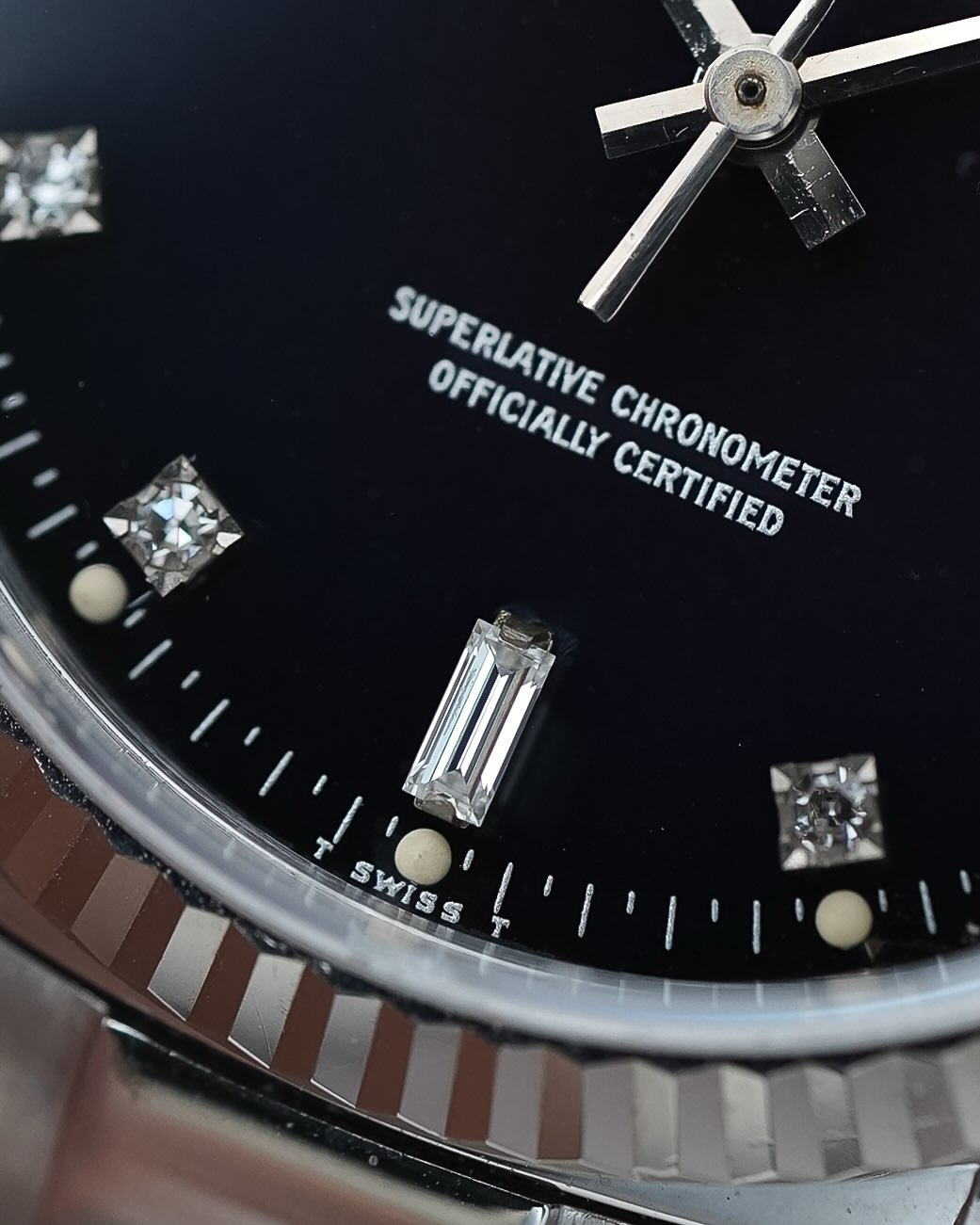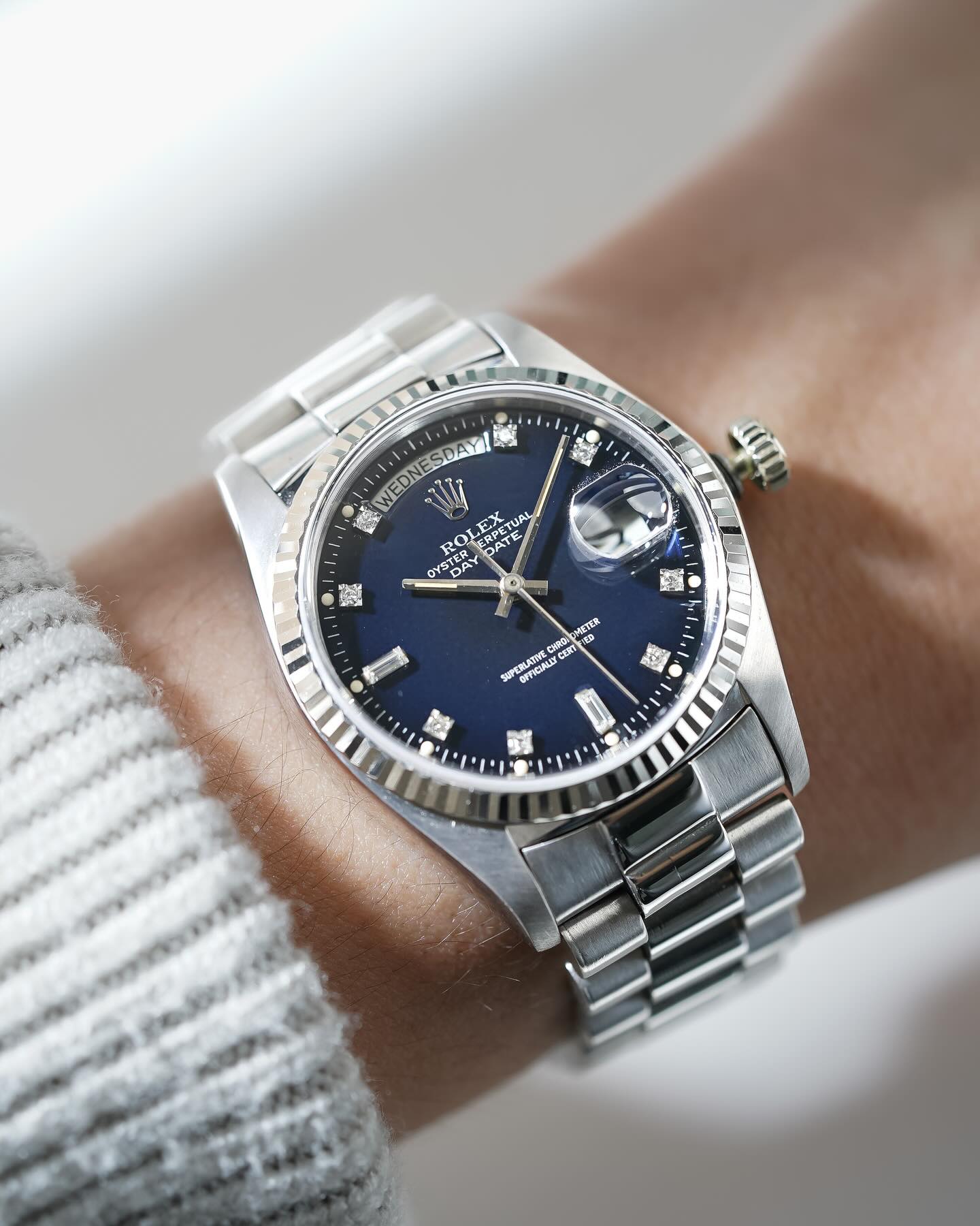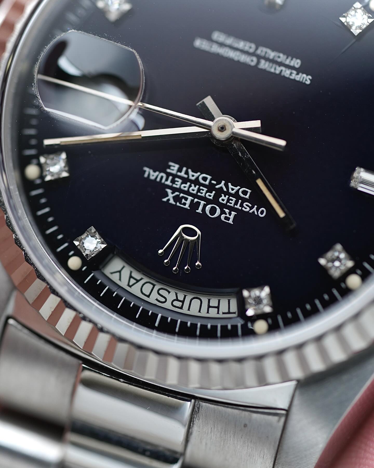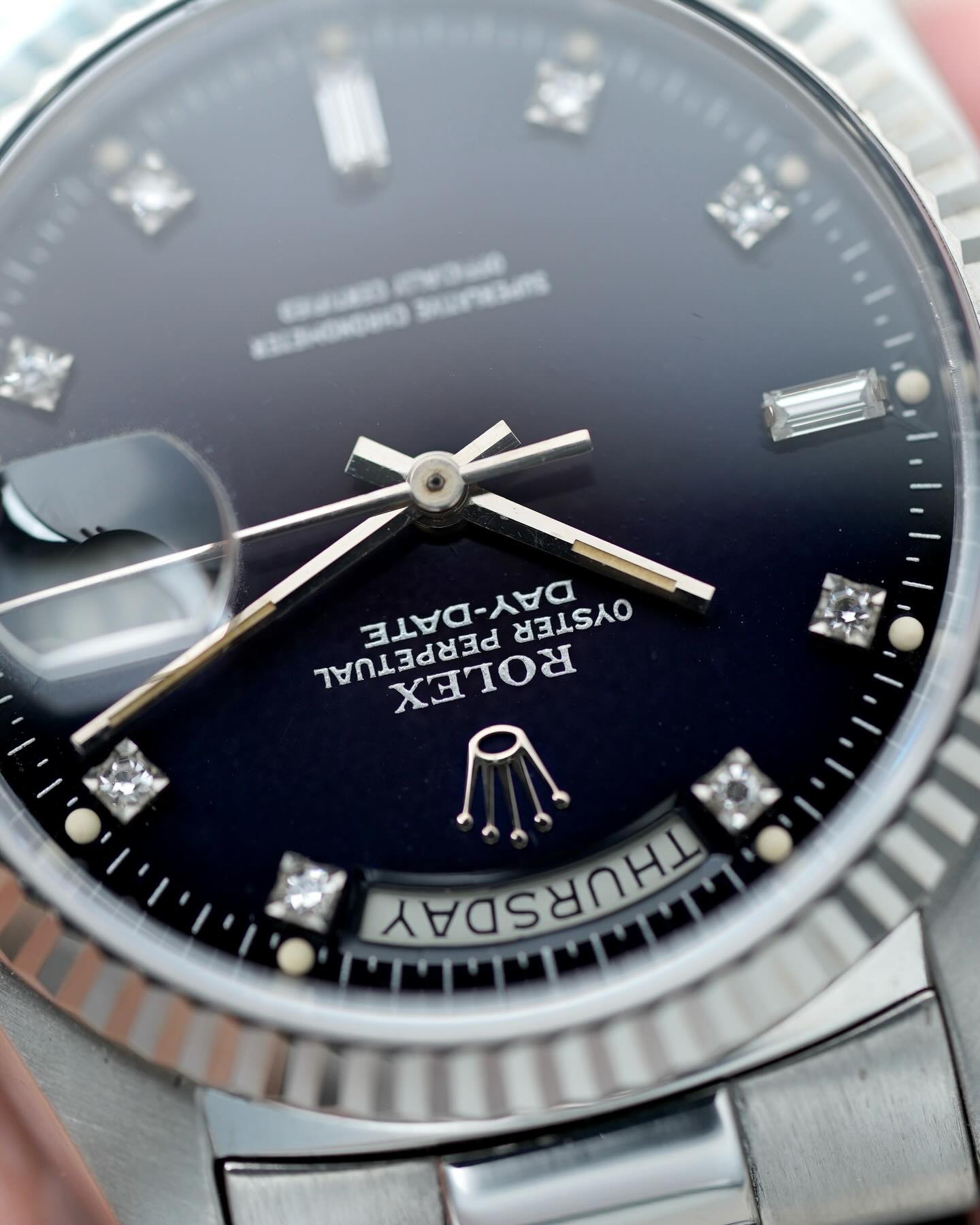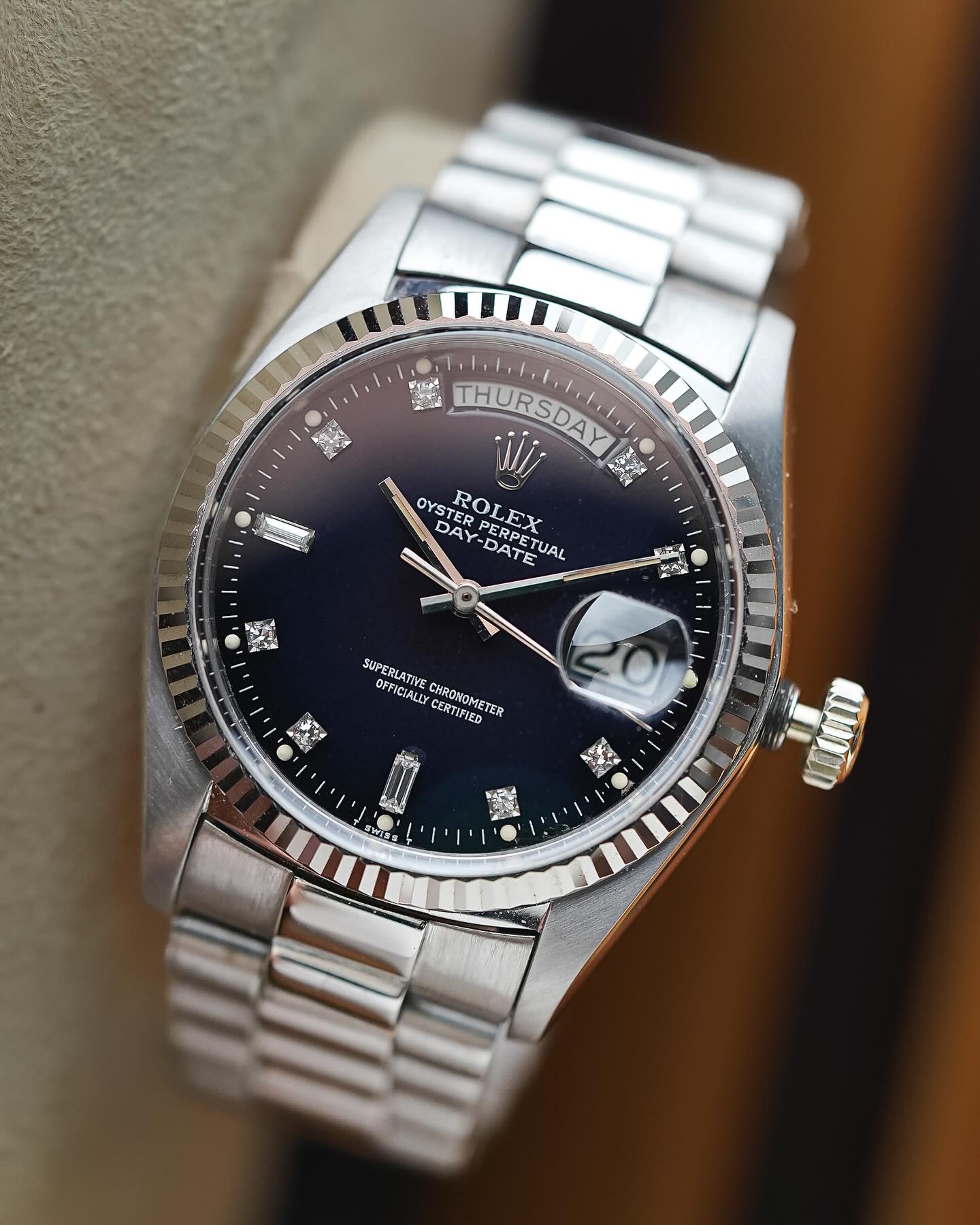 Rolex Dial Tropical Black blue faded Factory Diamond Setting Full gold 18k white gold – 36MM Daydate White Gold – Only Watch Ref 18039 Series 5.7 M Y1987